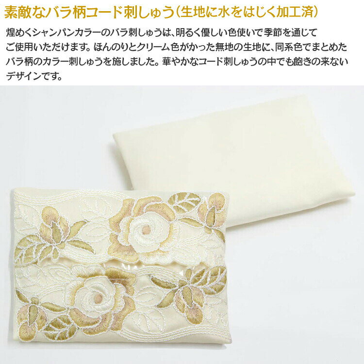 ミニティッシュケース コード刺しゅう 約9×12cm 外出 女子力 バラ柄 華やか ギフト 上品 光沢 シャンパンカラー 【ゆうパケット選択可】