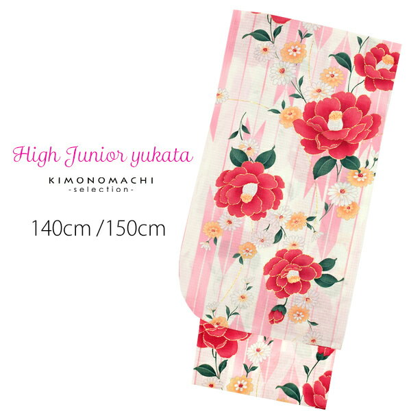 浴衣 子供 「白地ピンク矢羽 椿」 ボヌールセゾン bonheur saisons 140/150 女の子 ジュニア浴衣 子供浴衣 キッズ浴衣 変わり織り綿浴衣 花火大会 夏祭り 【メール便不可】
